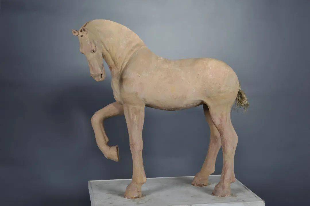 阿斯塔那336号墓还出土了一件唐代泥塑骏马(图6),也是正在进行表演的艺术形象,长61厘米,高58.3厘米,丰筋少肉,神态机敏,体质健壮,四腿修长,一只前蹄提起,似乎按着悠扬的乐曲轻盈地踏着步点,给人以强烈的力感和动感。