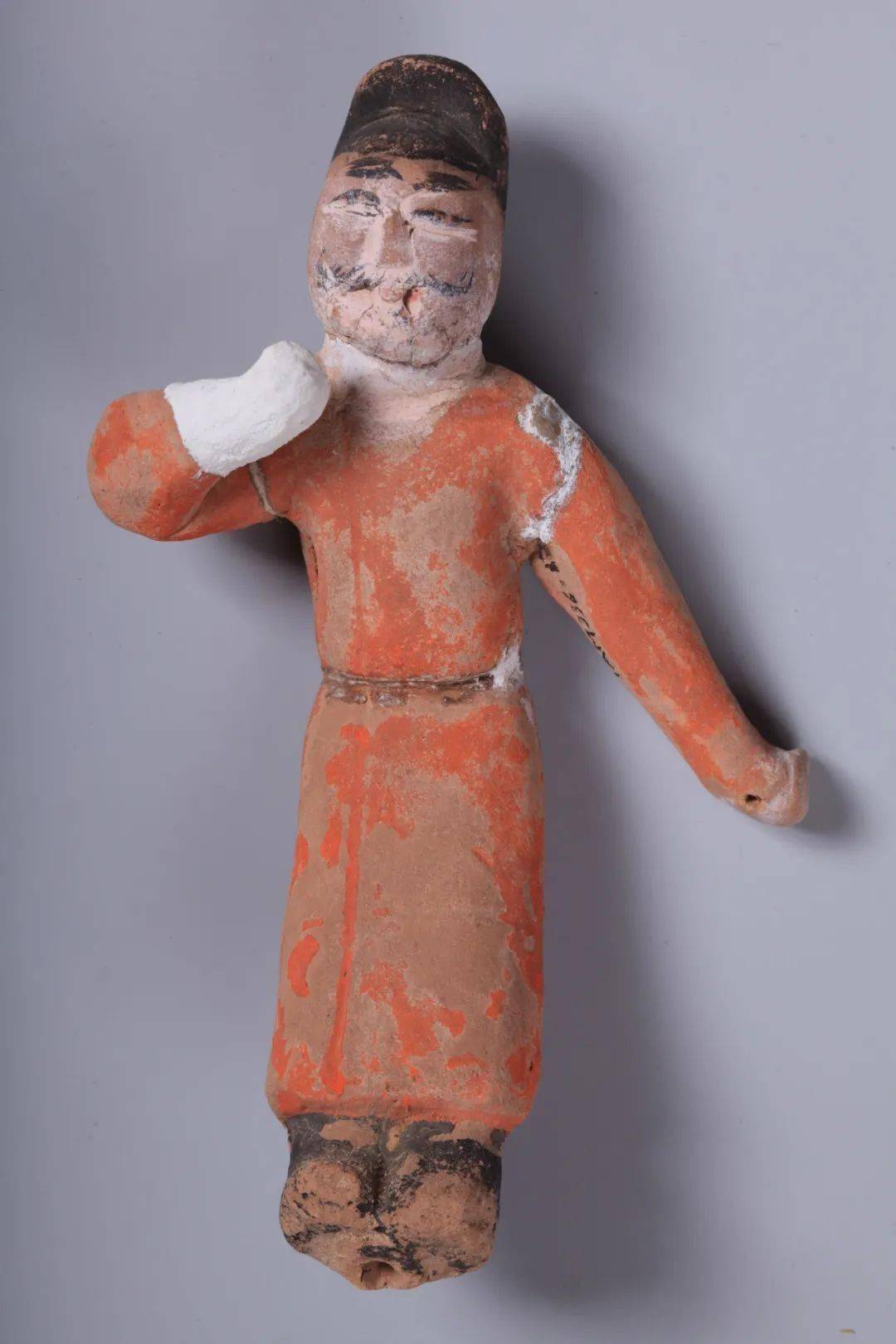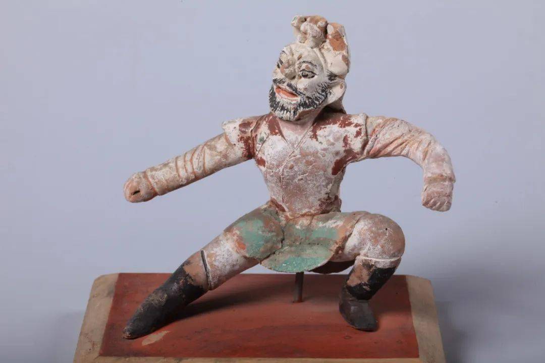 阿斯塔那336号墓出土的一尊彩绘泥俑(图2),塑造的可能是一位民间舞蹈家形象。该俑高13.5厘米,头戴黑色幞头,身着红色圆领袍和黑裤。大眼粗眉,唇上的胡须弯曲上翘,颇有情趣。左手臂稍抬起,右手置于胸前,弯腰,双脚并拢,似在邀请某人跳舞,动作滑稽,充满喜庆色彩。