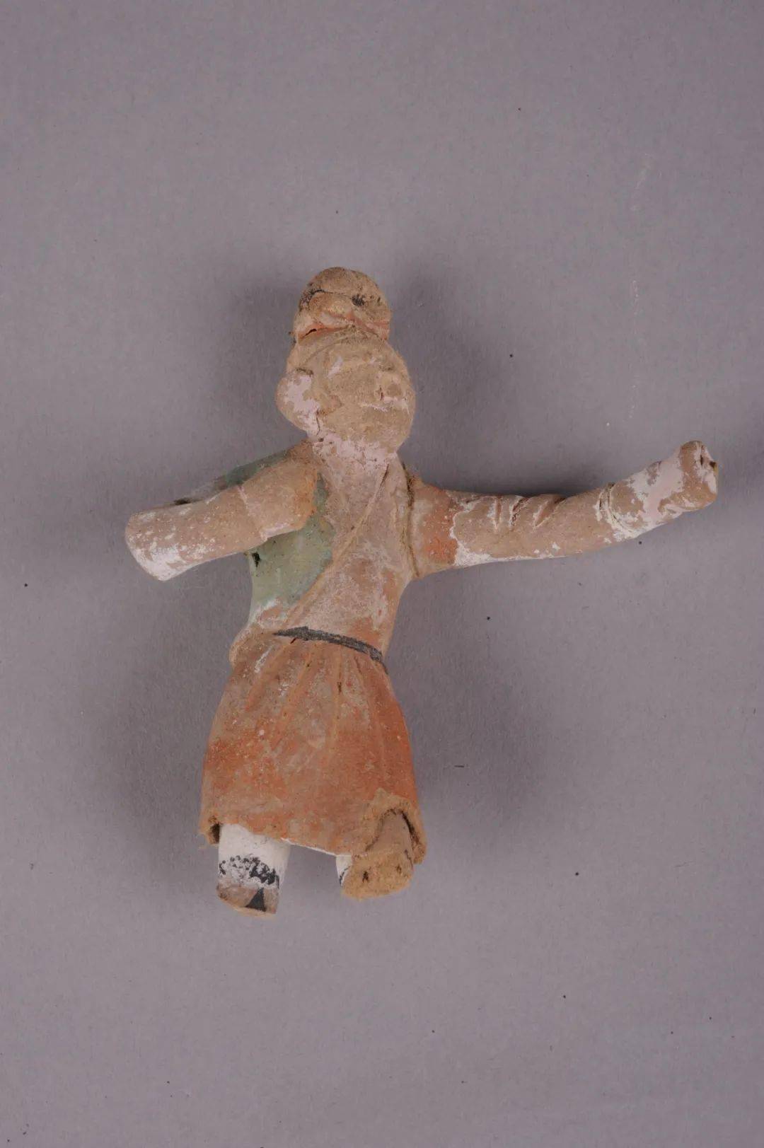 阿斯塔那336号墓出土的另一尊男舞俑(图3),也是彩绘泥塑作品,只见他头戴幞头,身穿绿色交领右衽袍服,腰束黑带,右手举于胸前,左手伸展,似乎在进行舞蹈,又好像在弹奏某种乐器。