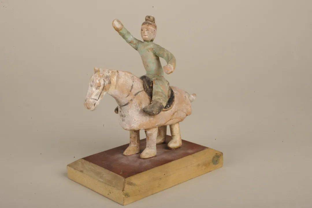 马术运动起源于西方,历史非常悠久,但查找中国古籍和考古发掘资料,不难发现,我国古代也曾经盛行过与马术比较相似的运动。特别是在唐朝时期,由于统治者的大力提倡,马术表演在皇家庭院中盛行一时。西域少数民族中也曾经流传马舞。据《书》“黠嘎斯”条中记载“戏有弄蛇、狮子、马技、绳技等”。“黠嘎斯”即柯尔克孜族的祖先,现在的柯尔克孜、塔吉克、哈萨克等民族都有马舞。但这种马舞的表演方式比较独特,以人模拟或装扮成马的形状进行表演。这种由人装扮成马进行表演的情况,在唐朝时出现在新疆的吐鲁番地区。1960年考古工作者在吐鲁番阿斯塔那336号墓中发掘出土的一尊彩绘泥塑舞马俑(图5),长12厘米,一人头戴幞头,身穿绿色圆领长衣,骑在一匹白马背上,右手执缰绳,左手挥鞭,面带笑容,昂首挺胸,形象地表现了骑马的武士刚毅而又乐观活泼的神态和诙谐,富有生活气息。当我们仔细观察这尊骑马俑,发现马的四蹄呈人穿着靴子或鞋的形状,由此可以推断出这尊彩绘骑马俑所表现的舞马表演,由三人组成,两人装扮成一匹马披上马的装饰形套,一个人擎着马头,双足作为马的前肢,另一个充当马的身尾,双足作为马的后腿,有一个人骑在马背上。