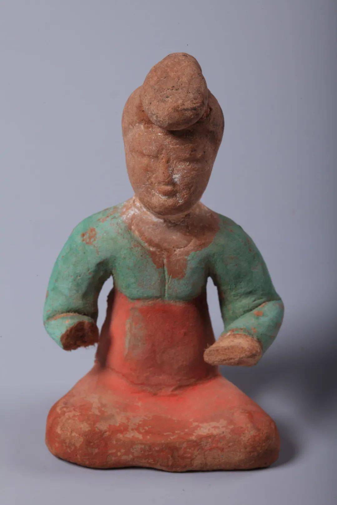 弹奏女俑(图8)也出土于阿斯塔那336号墓,是一尊彩绘泥塑作品。俑高9.9厘米,脸型圆满,凹凸雕刻出五官,盘坐于地,右手残损,左手较为完整,作抚琴弹奏状,弹奏的乐器应该是五弦琴、古筝等弹拨乐器。该俑上身穿蓝色对襟窄袖襦衣,下穿红色长裙。其头发梳成圆发髻,垂于额前,这种发式在中国古籍中被称为“乌蛮髻”。乌蛮髻是盛唐时期流行的一种时尚发式,来自唐代南方叫乌蛮的少数民族,其特点是将头发掠向后脑,在头顶挽成一髻,然后朝额前垂下。这种发式和著名的回鹘髻一起流行于中原地区,深受当地居民的喜爱。