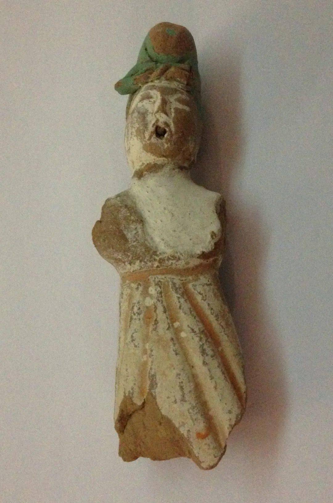 歌唱俑在全国十分少见,阿斯塔那336号墓出土的这尊彩绘泥塑作品(图9),保存得不是很好,但依然可以看出泥俑的服饰和面貌神态。该俑高9厘米,宽2.9厘米,头戴男子幞头,身着百褶长裙。面目刻画得十分传神,头颅上扬,小嘴洞开,似乎在引吭高歌,表现的是一位女着男装的歌唱者形象。